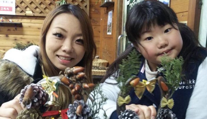 「昨日の第1号」 昨日のものづくり工房に最初に来てくれたおねえちゃん、ドングリネックレス作りに挑戦。 牧場のマテ...