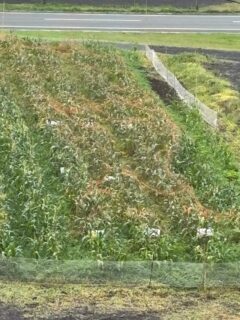 収穫が近くなり、防鳥ネットや電気柵で畑ごと包み込む。