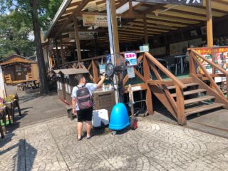 入口に、ミスト付扇風機を設置してみたら、多くの方が立ち止まる・立ち止まる。