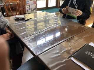 乳しぼり会場に並んでいる方々が暑くないように寒冷紗を張る。