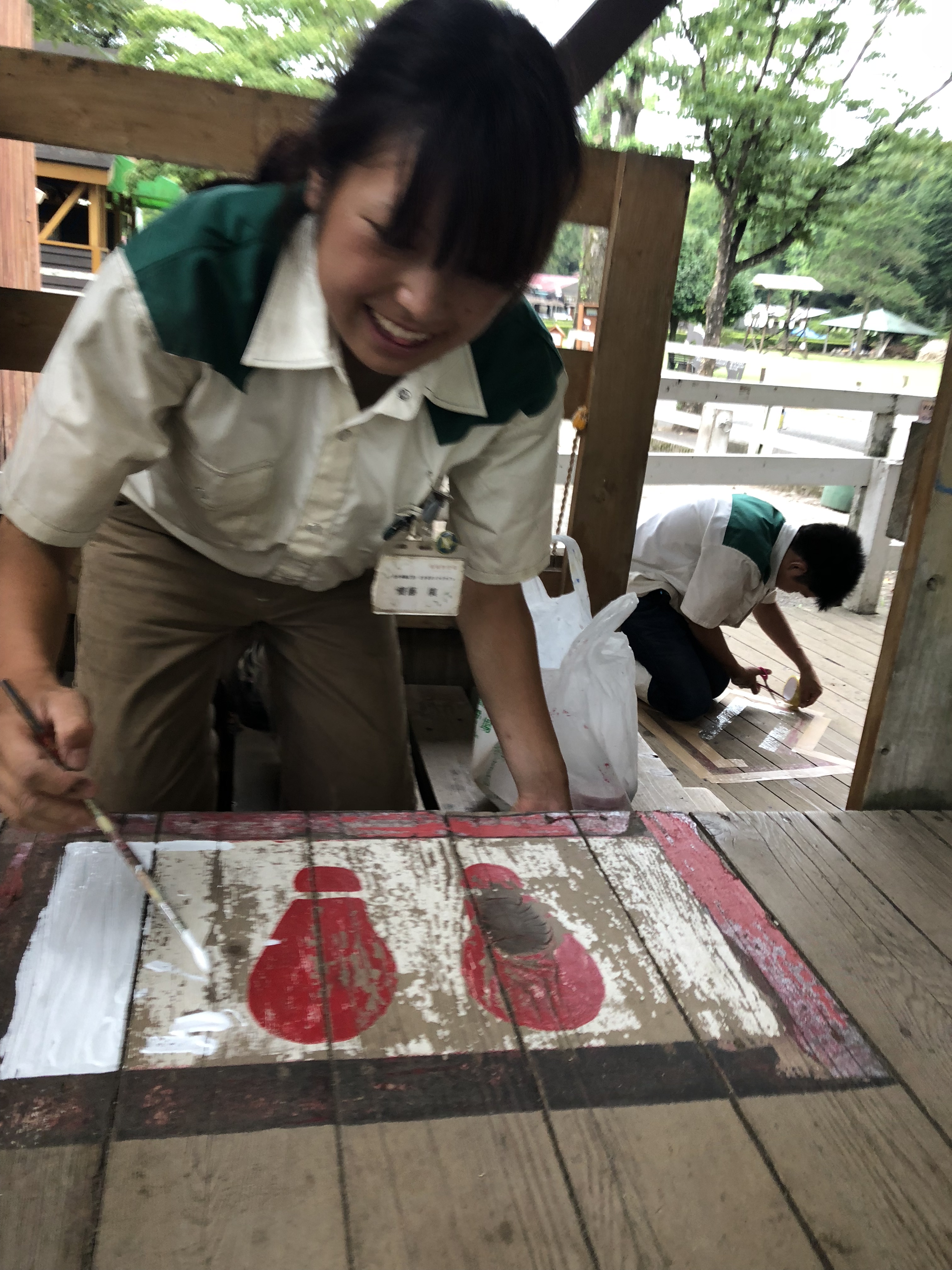 学生さんとともに、乗馬コーナーの足元表示をサイトウお姉さんが描いていた。
