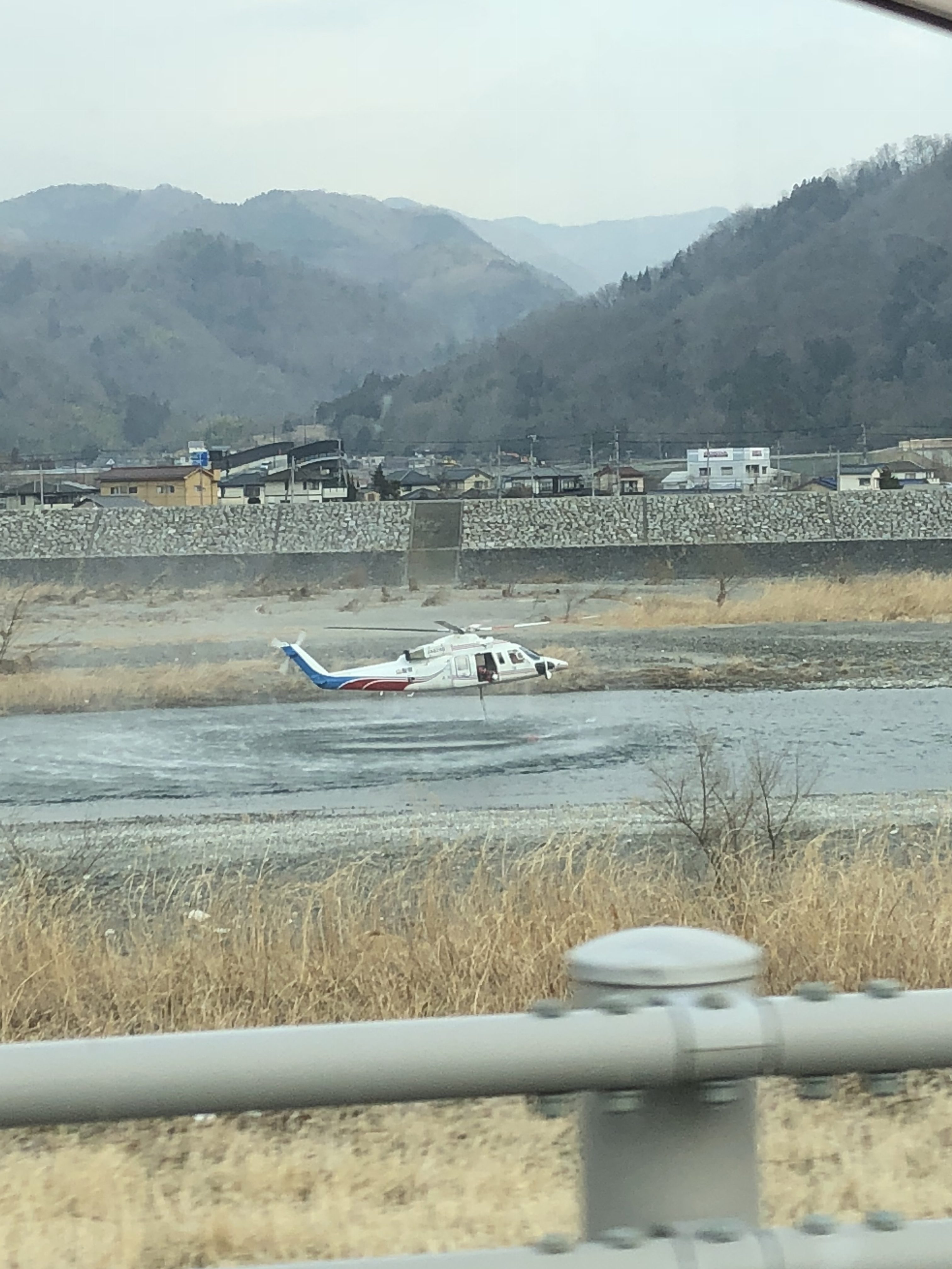 山で火事があり、道路が十分使えないのでヘリコプターで川の水を汲んで消火作業をしておりました。