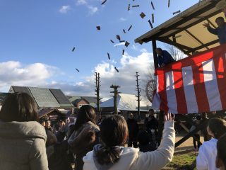 お菓子まきは、一気に多めに。広く投げるのがポイント!