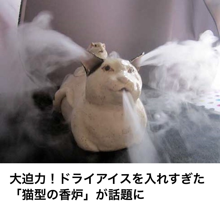 「ドライアイスを入れすぎた【ネコ型香炉】」。