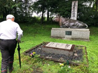 馬飼野社長と場内を行く。(慰霊碑お参りは欠かさない)
