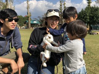 うさんぽに登場するウサギは、「人は怖くないよ、大丈夫」という事を知ってもらうために人の多い場所で人慣れする訓練を積んでおります。