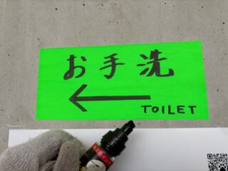 駐車場で、「お手洗←」と書いた