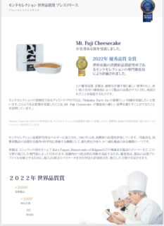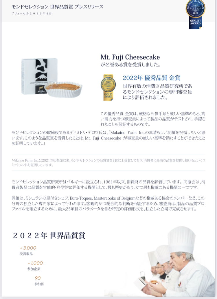 この度、まかいの牧場のチーズケーキが世界的な権威「モンドセレクション」で金賞を頂きました!