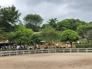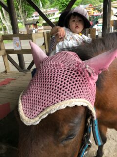 親子で馬に乗ったリコちゃん、「もう1回お馬にのらないと帰らない」という