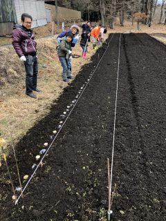 クワの使い方も聞き、畝を切って、ジャガイモを並べ、間に肥料を入れてから土をかぶせる。