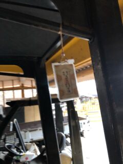 重機や、ナンバーのある車両には厄除けのお守りを取り付けており