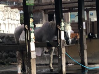白い馬は、黒い肌の場合が多く、水でびしょびしょにすると黒い肌が透けて見えます。