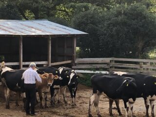 それを見ている馬飼野社長、牛の慰霊碑でお参り直後に