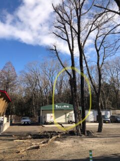 ※この写真は、営繕さんに伝達する為に撮って、黄色く丸く描いて見せました。「処理してほしいのはこの樹です」と。