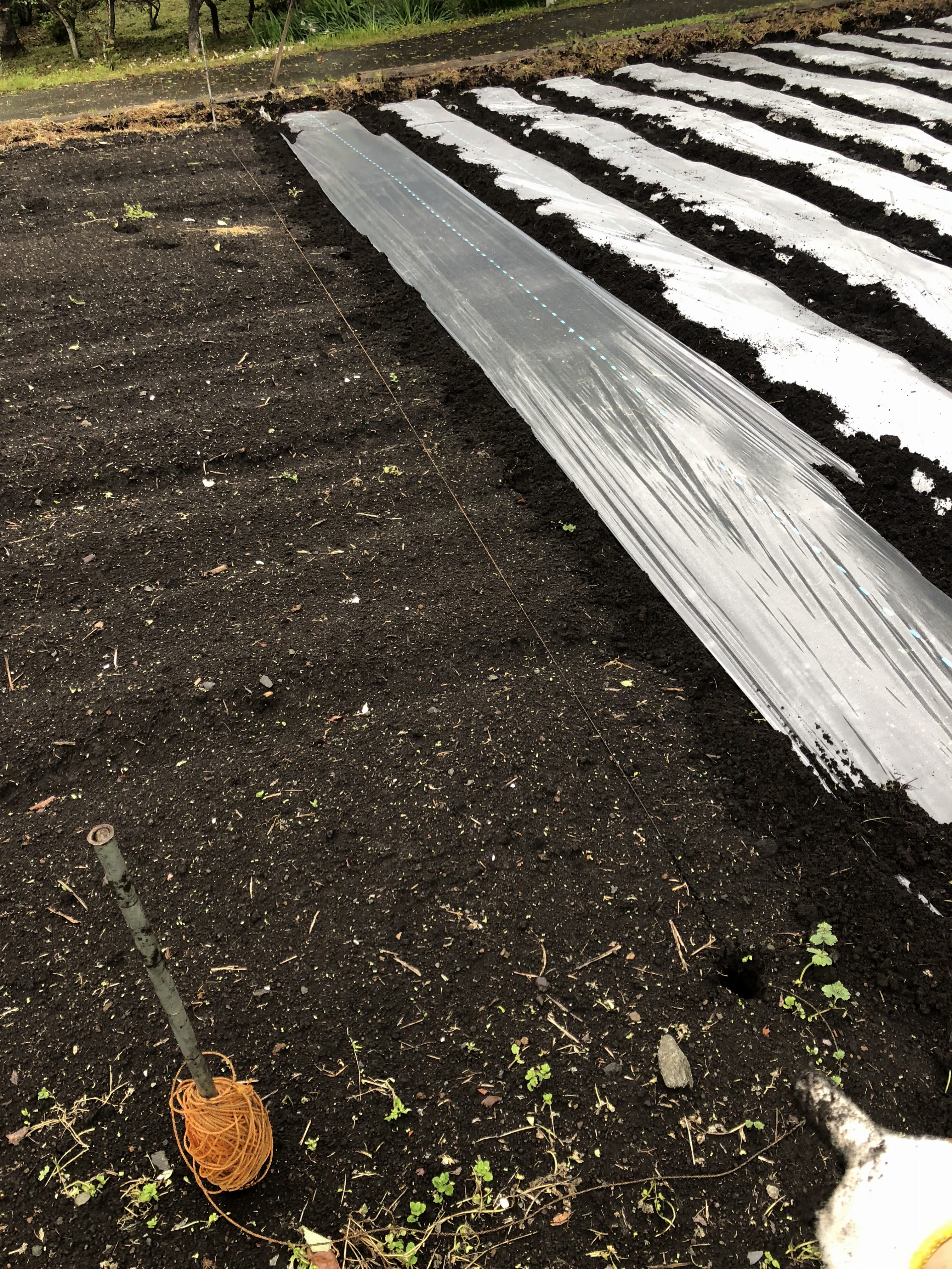 すると、次の列にひもを張る際に、畑の向こう側から引っ張るだけでできます。