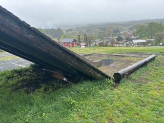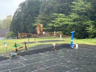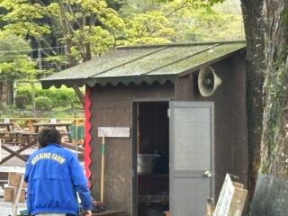 イデお兄さんが、乳しぼり会場とヤギのお散歩に屋外用スピーカーを取付完了。