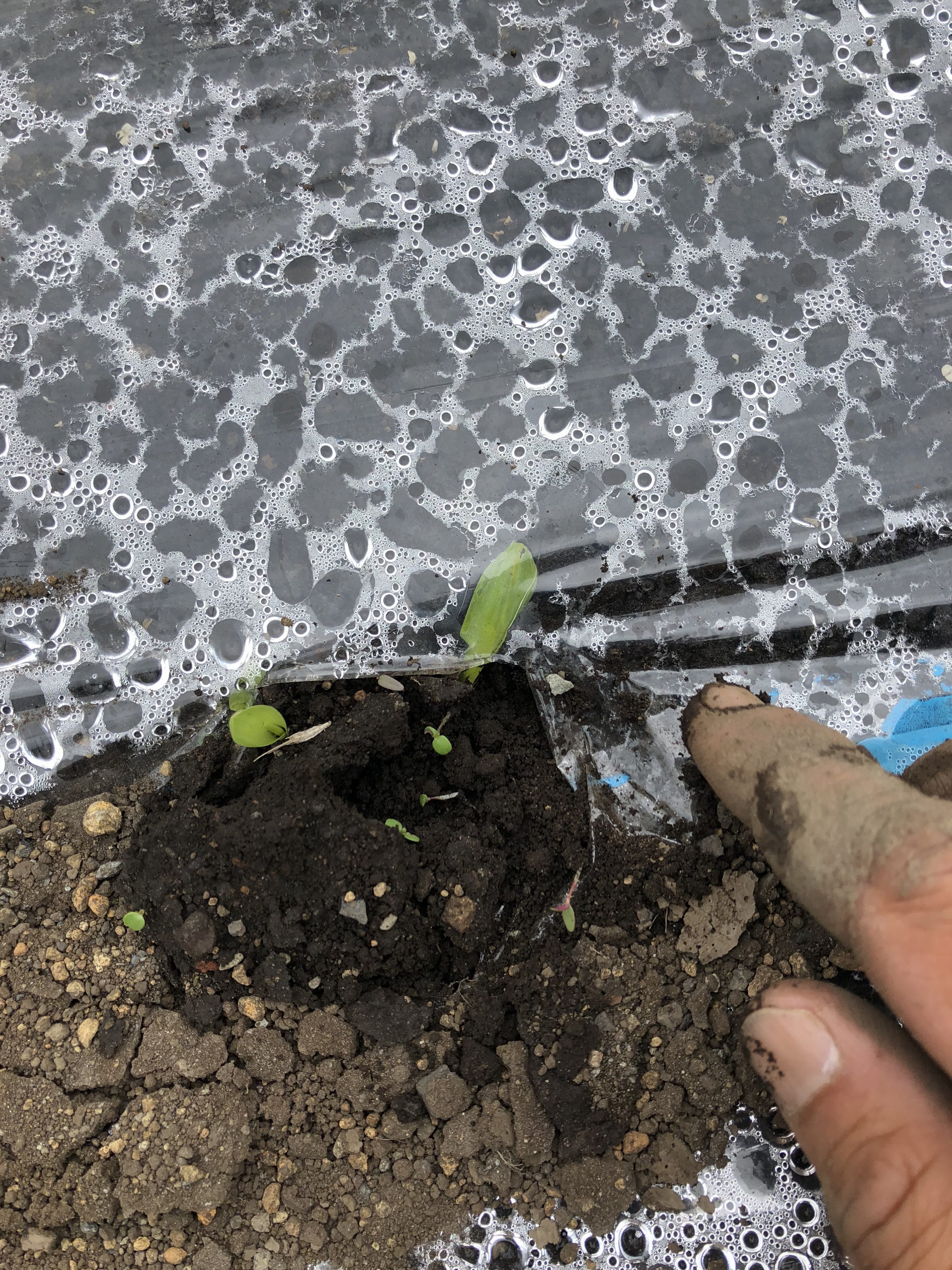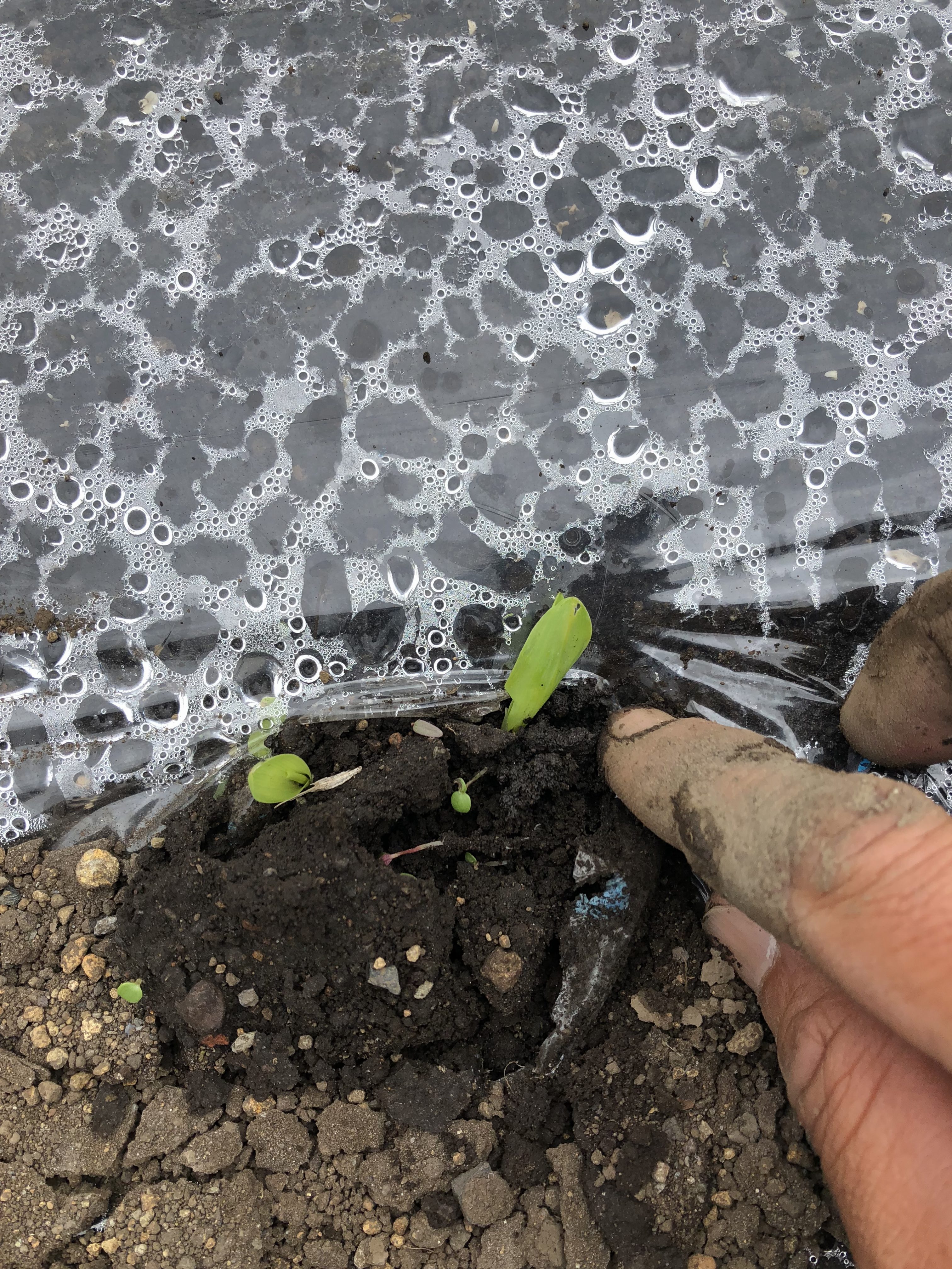 ビニールの穴が小さすぎたり、まいた種が穴からズレていたりすると・・・