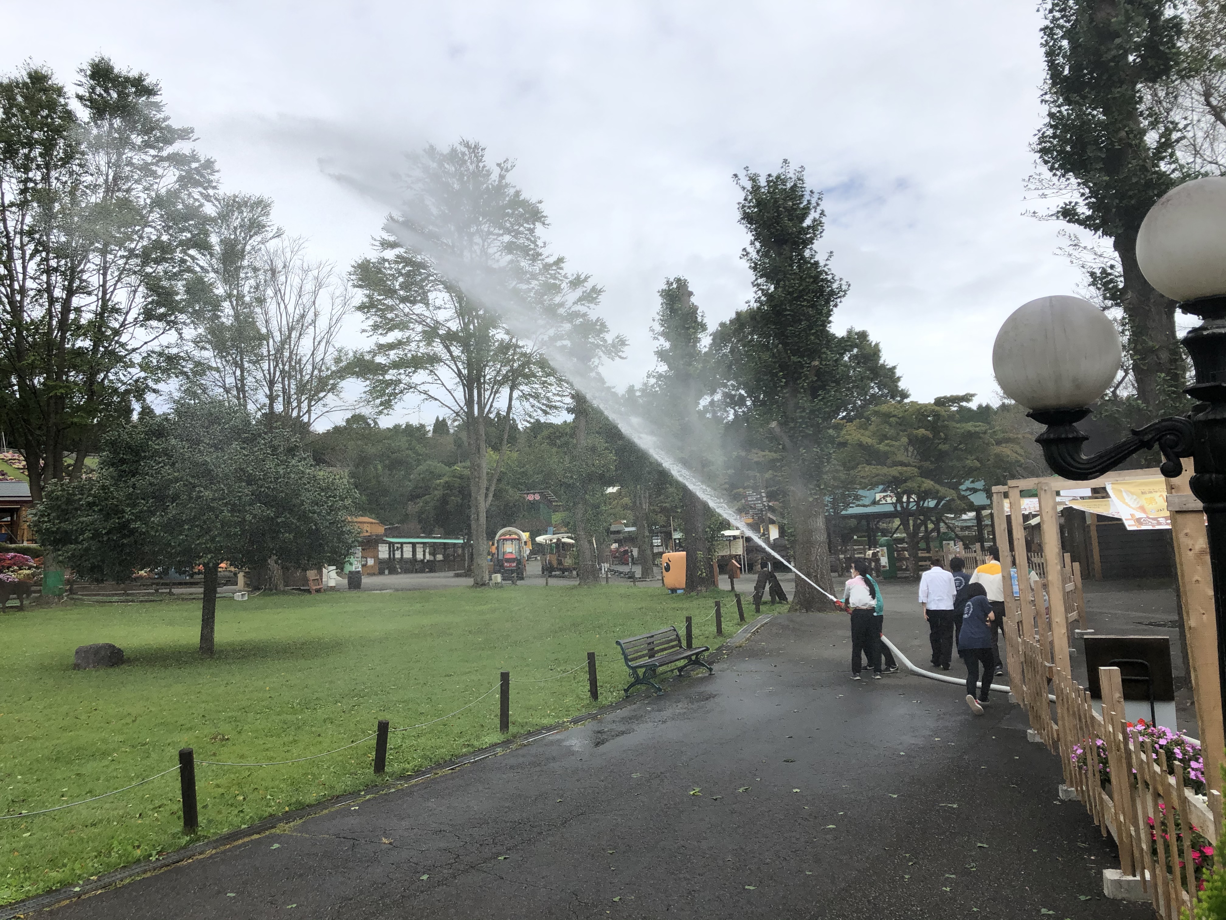 昨日の防災訓練は、救急セットや嘔吐物処理キットなどの使用期限や内容の確認、放水マシンの操作などを行いまして。