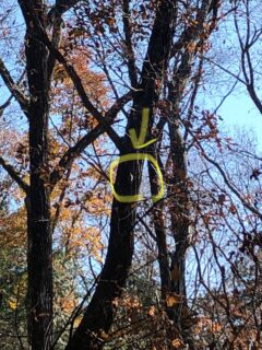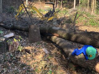 ものすごく、倒れてはいけない方に傾いている木を、色々な技術を組み合わせて