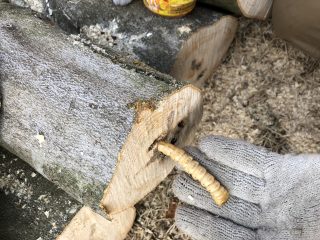 長い虫。カミキリムシの幼虫でしょう。