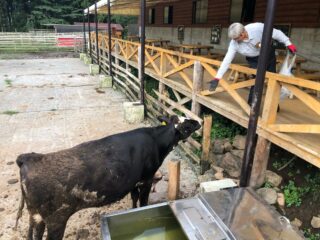 写真下の牛の飲み水の中にはキンギョちゃんが多数飼われており。「育成牛金魚水飼育促進法」を実践中。金魚(より赤い方が効果が高い)を牛の飲み水の中で飼育する事で、その金魚の分泌物が牛の脳下垂体を刺激し、幸せホルモンであるオキシトシンの分泌を促し、子牛のより安寧育成に繋がり、乳牛としての役割を高度に達成できる画期的な「育成牛金魚水飼育促進法」です。