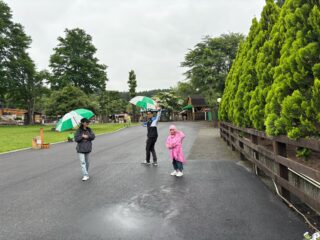 土砂降りの中で、フォトスポットや遊具で、海外の方が