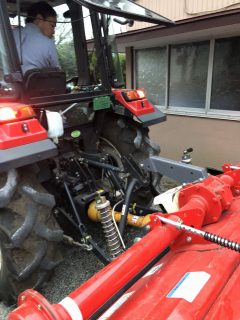 耕運部分(ロータリー)を接続させる方法をヨシダお兄さんに伝授。