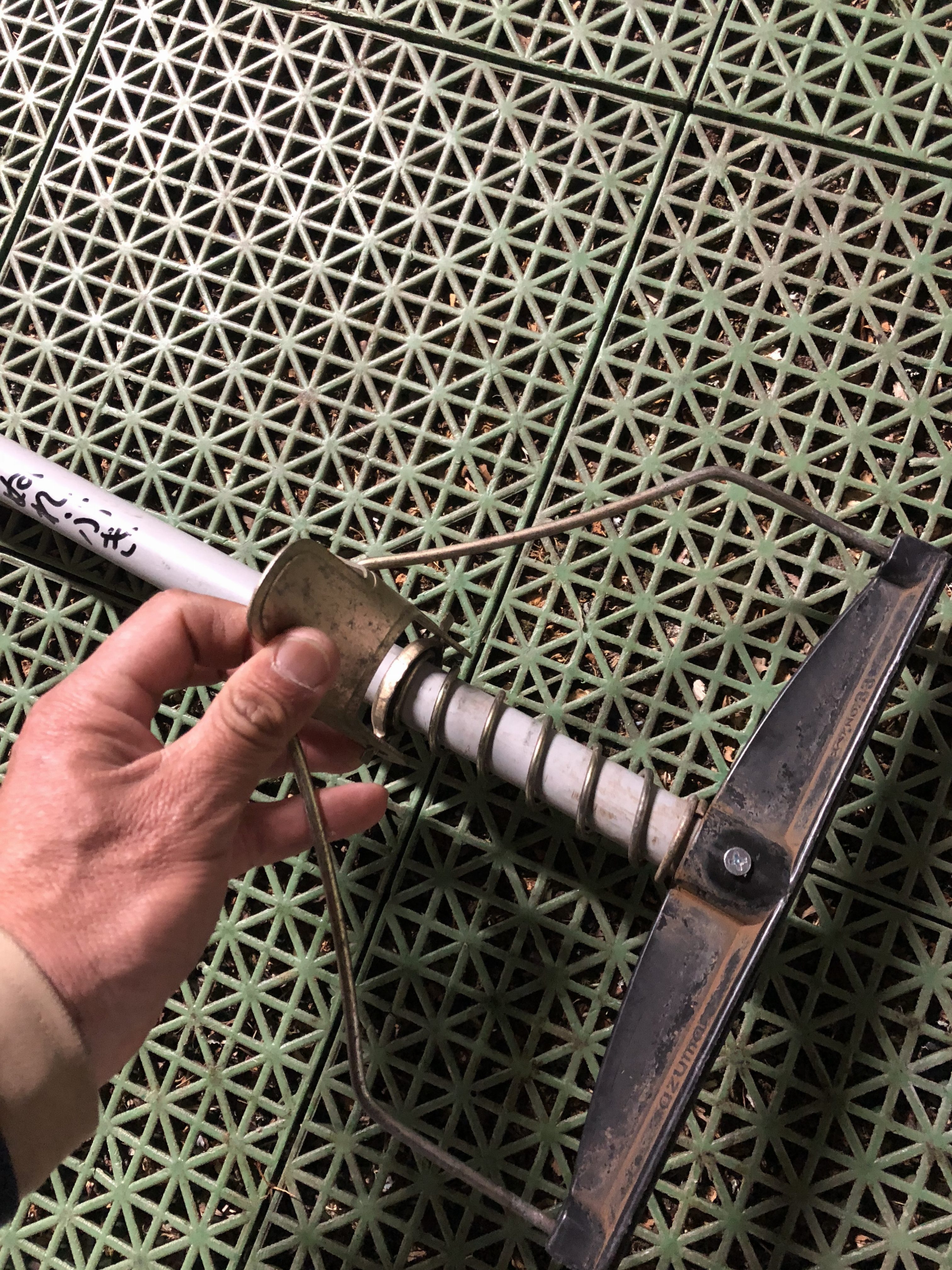 モップの棒部分。先端がさびて崩れ落ち、壊れたので、先を切り落として刺しなおし、ビスで止めて修理。