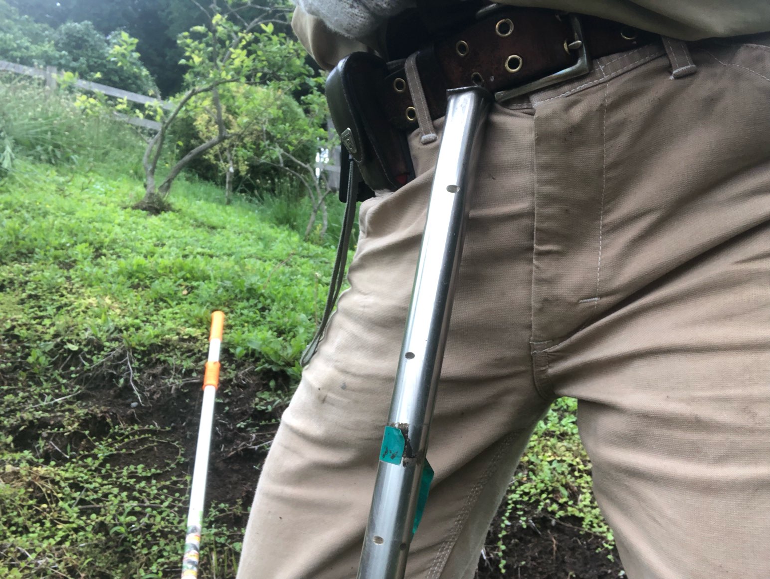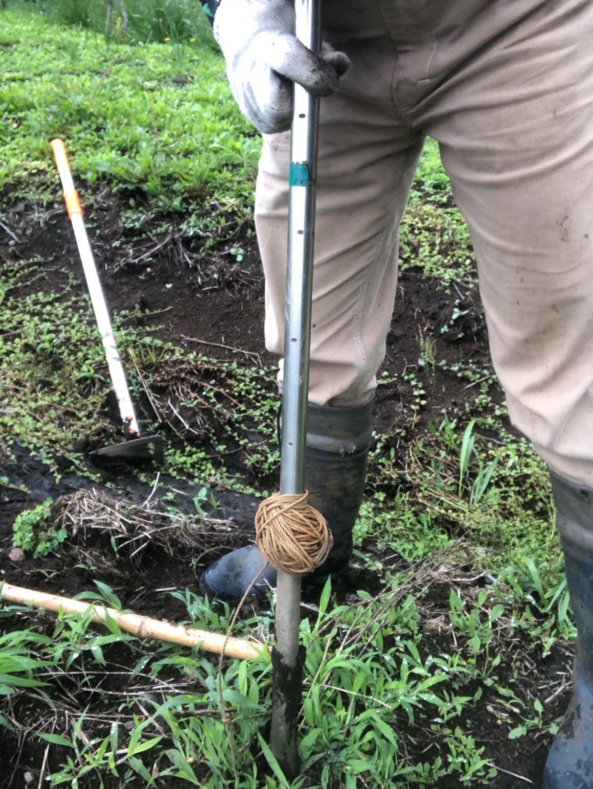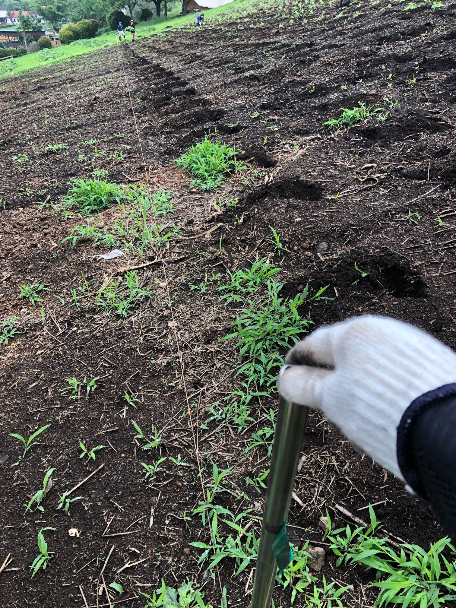 紐を張る際も、「ヒモを引っ張たら、畑の反対側の棒が抜けちゃった」だけで広い畑の無駄歩き発生。