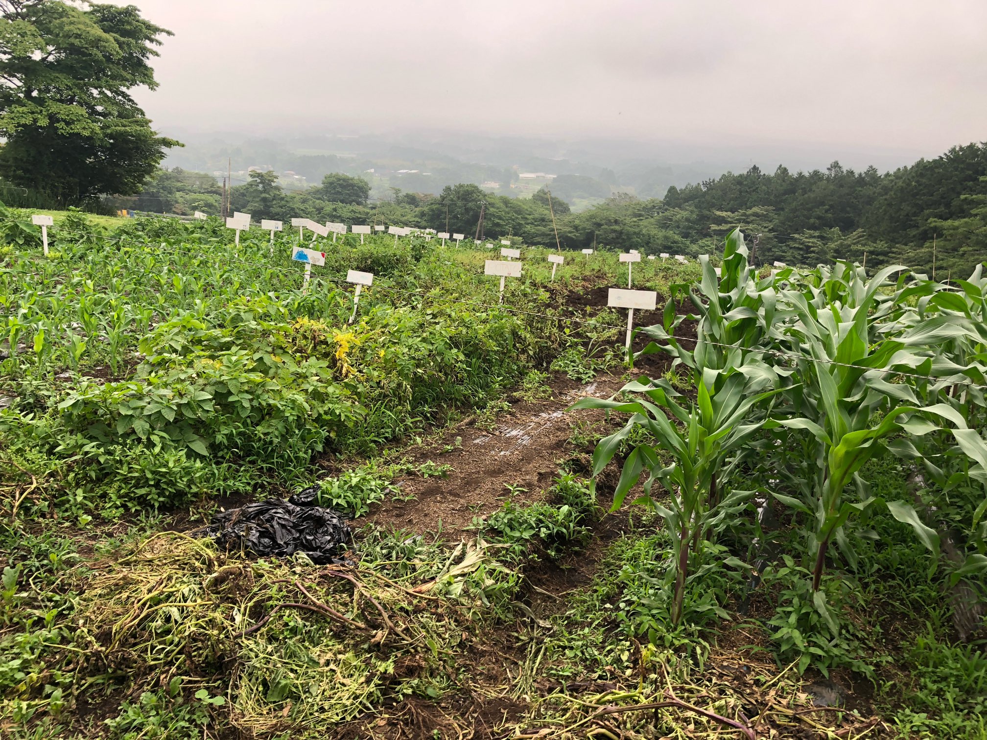 写真↑手前は、グングンツルが伸び始めているサツマイモ畑。