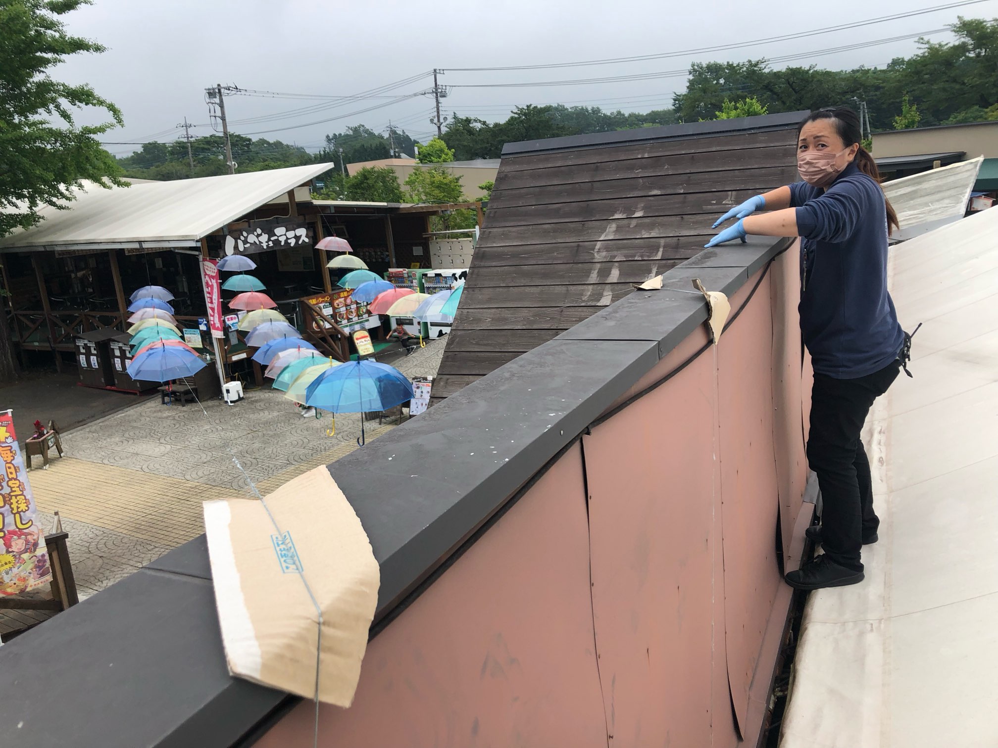 一緒に屋根に上がり、ギューッとひっぱってもらい