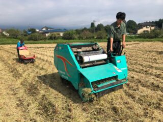 田んぼで稲の茎(イナワラ)を、餌(サイレージ)にするためにマツキお兄さんなどが頑張り中。