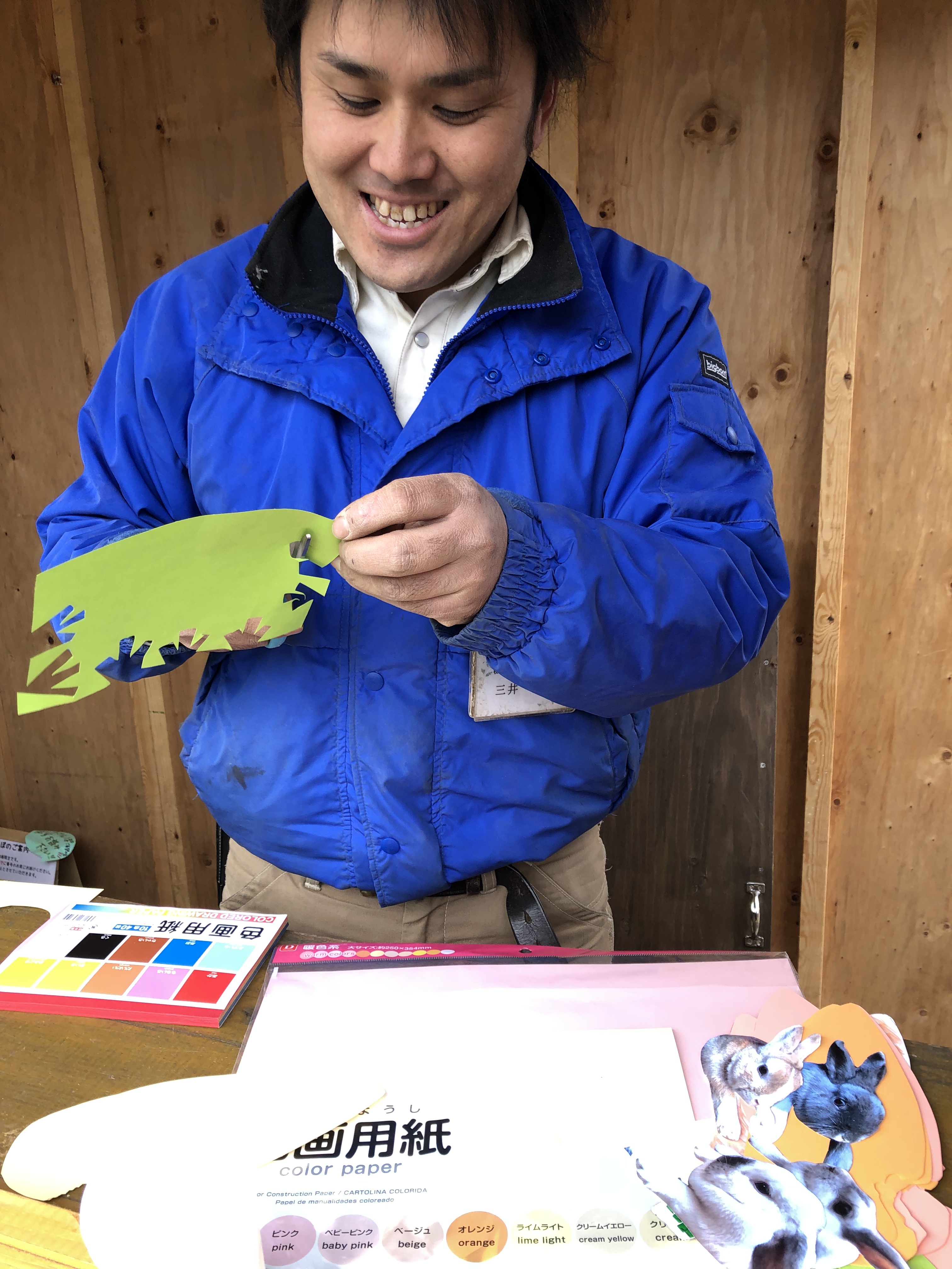 ウサギの名札作り、ヤギお姉さんとミツイお兄さんが頑張る。