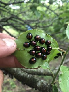 葉の裏に、アカホシテントウの成虫が集まっていました。