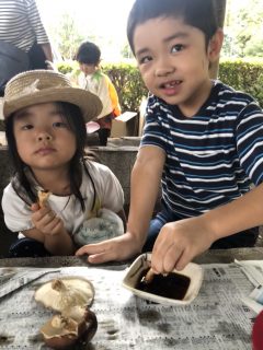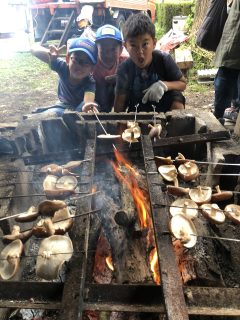 串に刺して、たき火であぶって、お醤油でいただく!