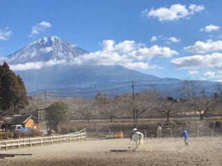 調馬索(ちょうばさく:馬運動用の長いヒモ)で馬を運動させる勉強中の