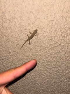 終わって出てきたら、壁にヤモリちゃんの生まれたて個体を発見。