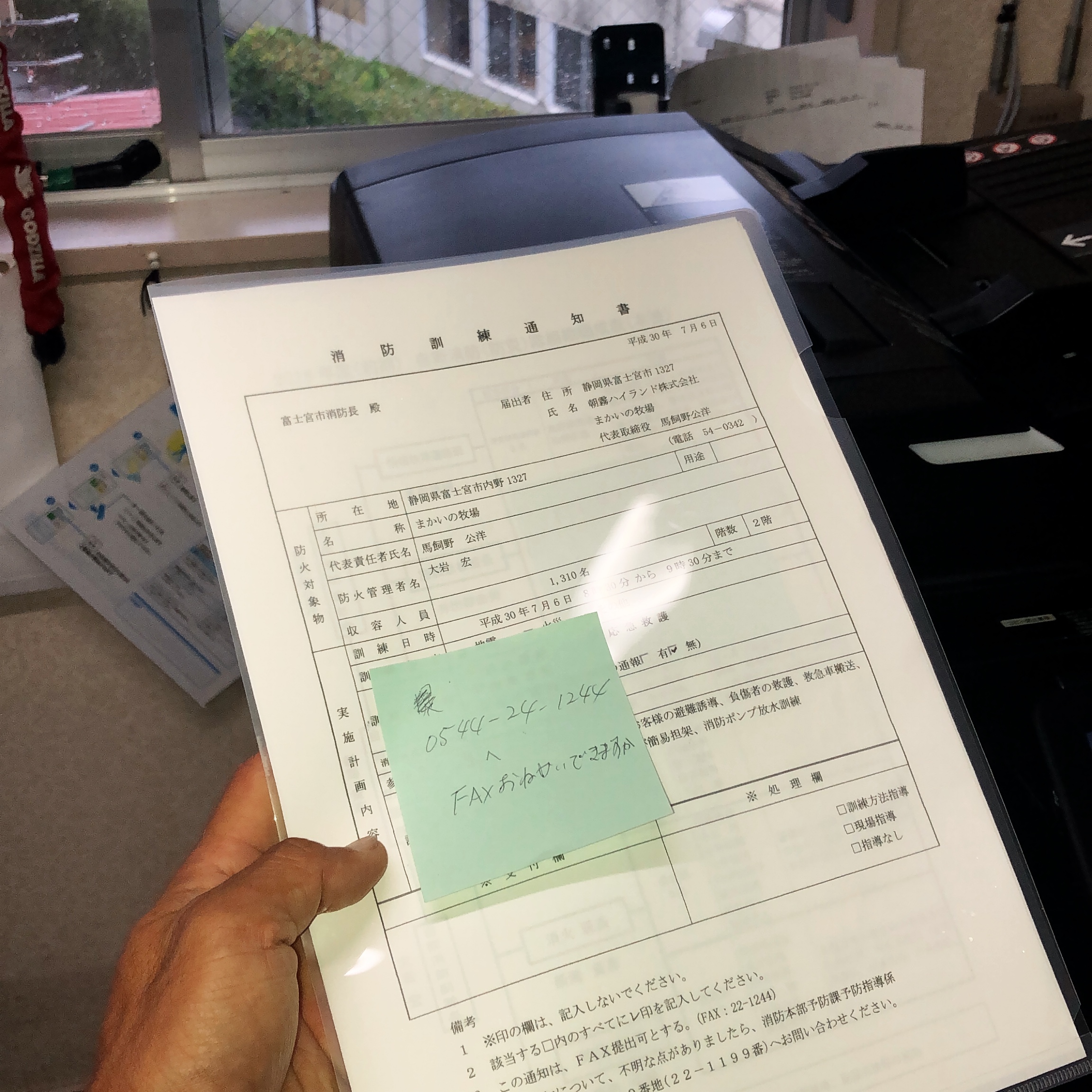 その訓練開催を事前に連絡する必要があるので、ファックス。