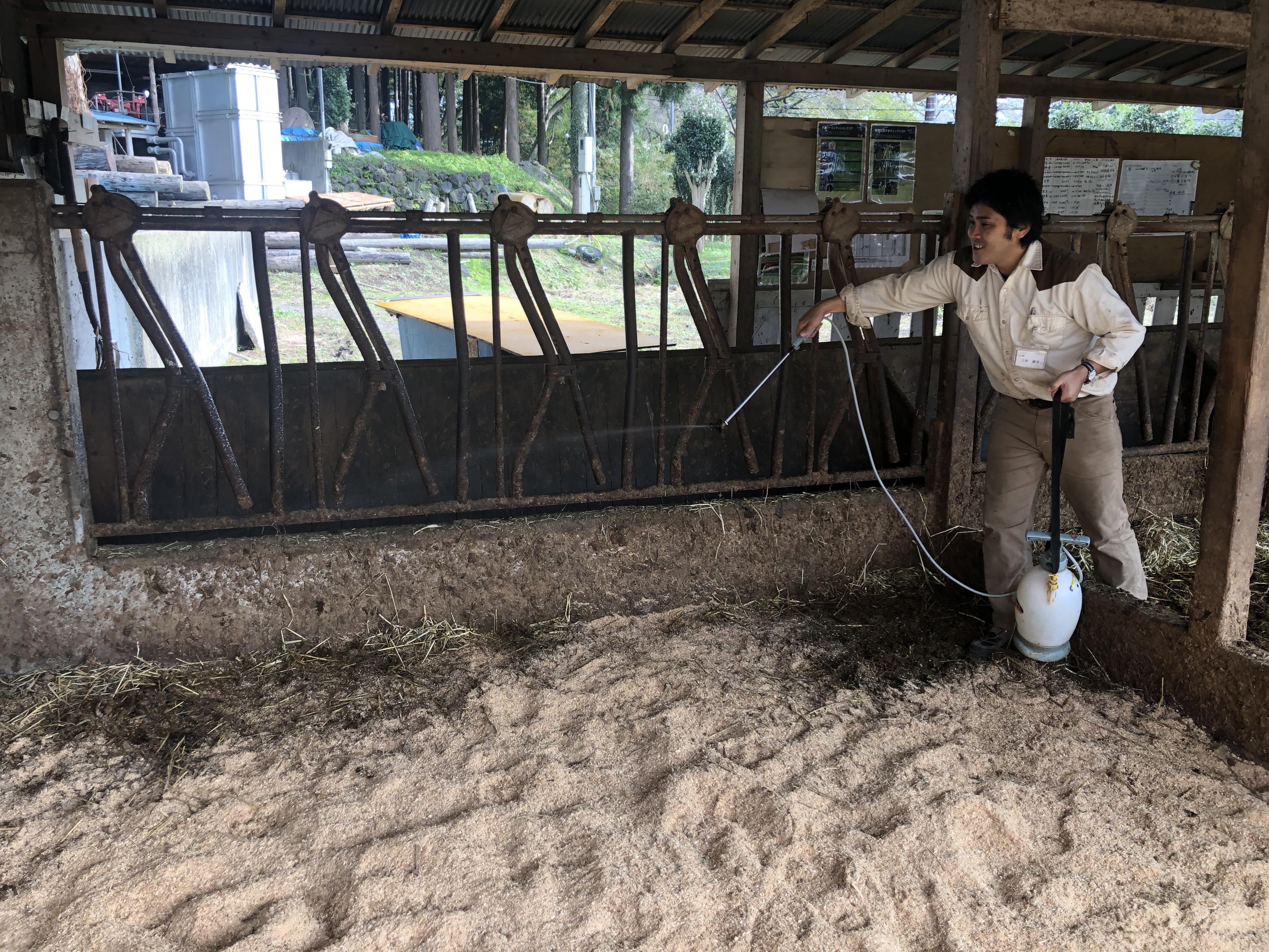 牛にイボがちょびっとできて、接触感染するらしいので牛舎全体の消毒をするミツイお兄さん。