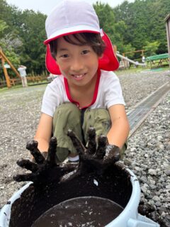 遊具ではいよいよ最後になる「田植え体験」を、リョウマ君が堪能!