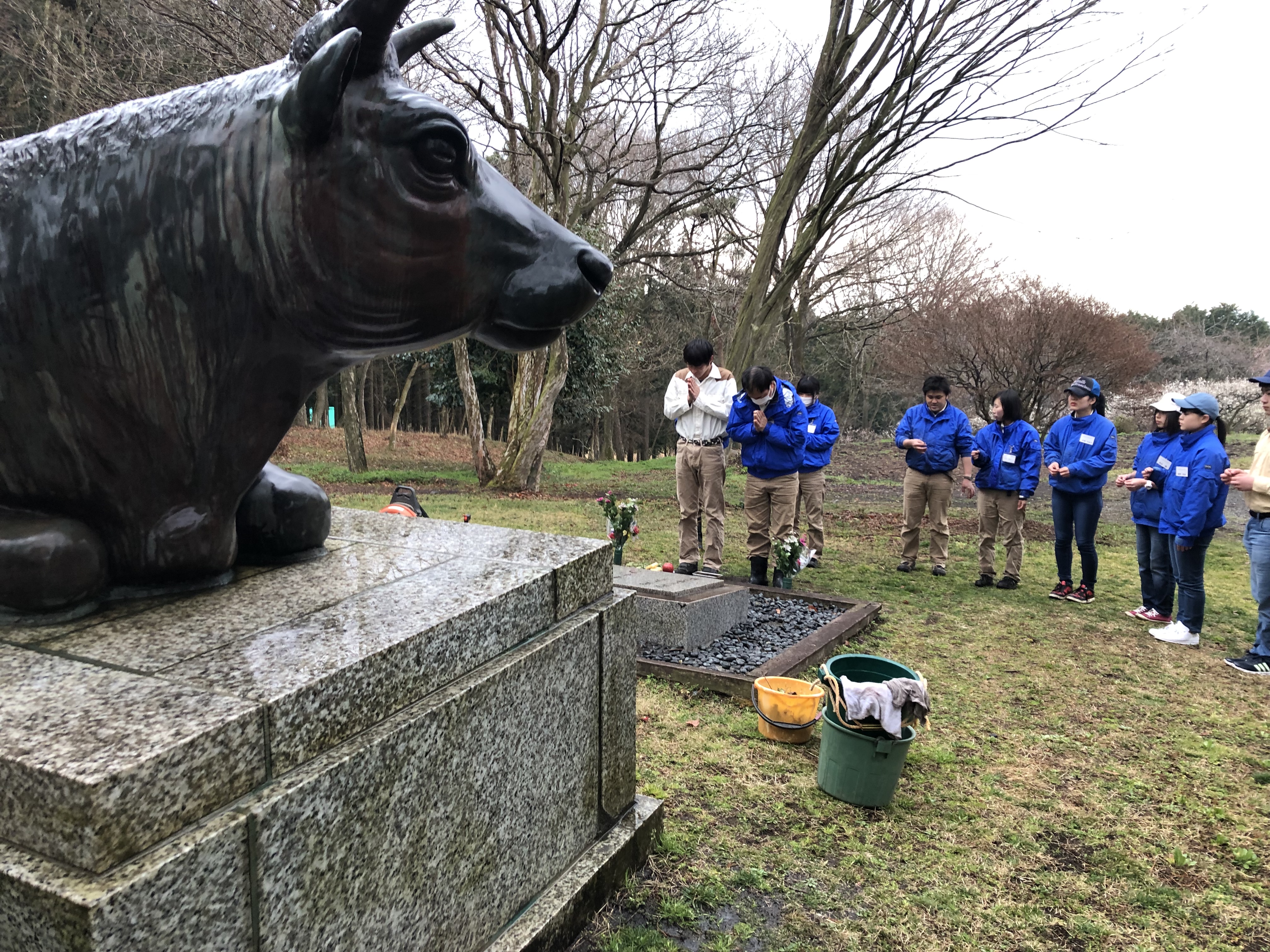 春のお彼岸、みんなで牛の銅像(慰霊碑)を磨き上げ、掃除して、お参り。