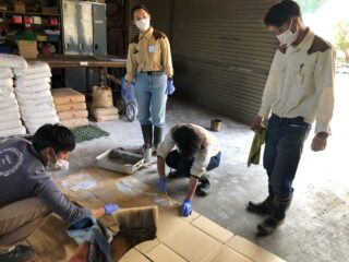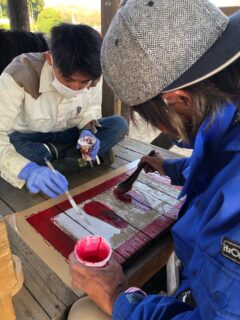 お散歩ヤギの番号を描きなおし中のモトキお兄さんたち。