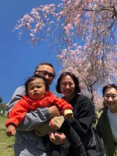 桜と青空と、おじいちゃんおばあちゃん、母と孫の笑顔。