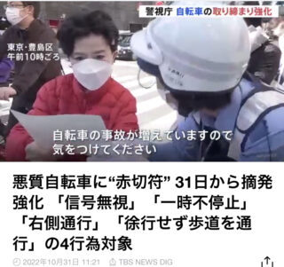 「信号無視」「右側通行」「一時不停止」「徐行しない歩道通行」の4つを強化して取り締まるそうな。