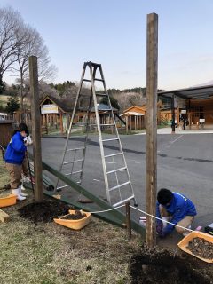 乳しぼり会場の日よけをつけるための柱を立てる