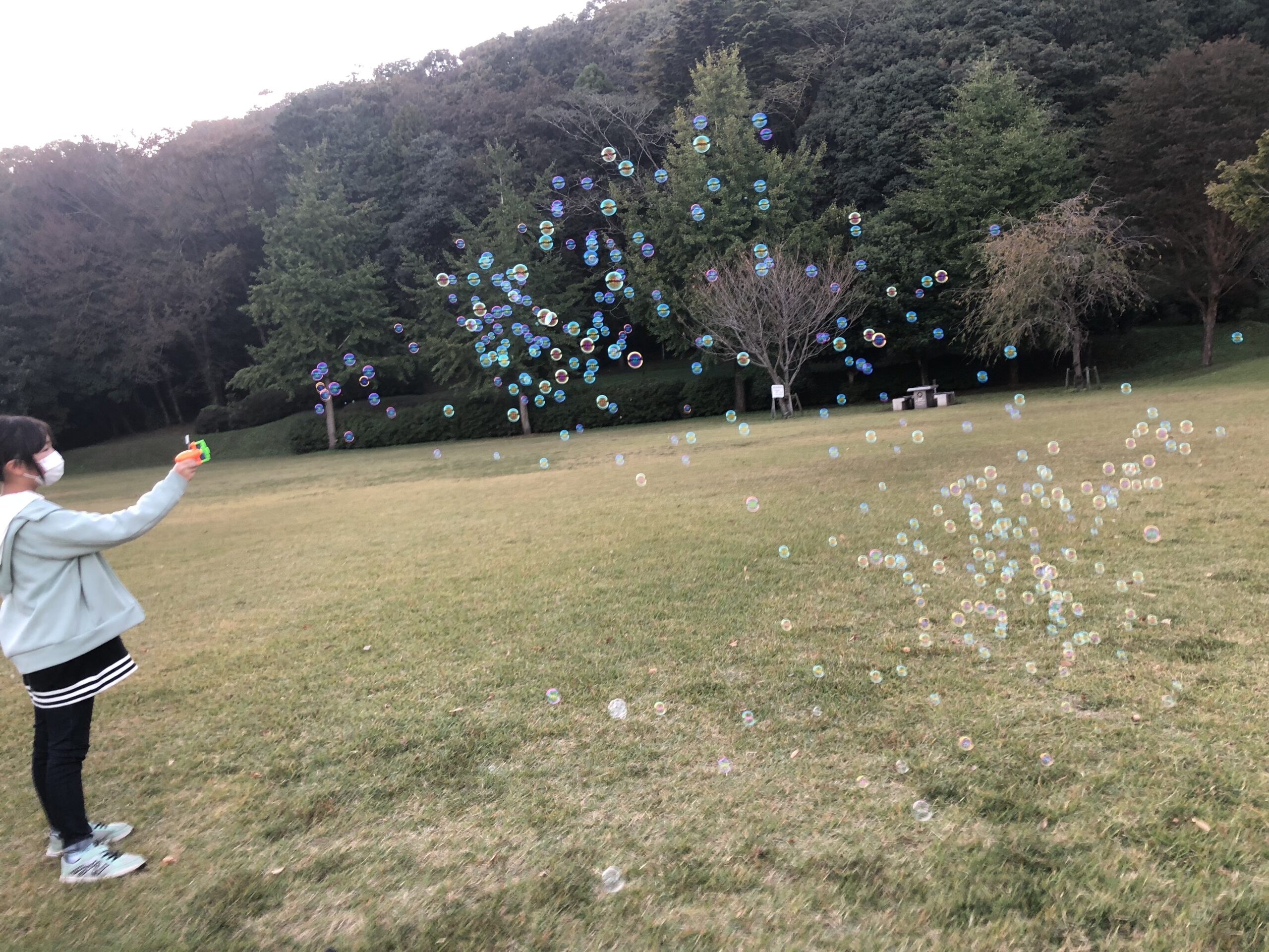 娘とシャボンダマをして「色が変わる秘密」「ゆうれいシャボン玉」「大きいのを作るコツ」「晴れと曇りの見え方の違い」など科学教室開催。