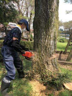 倒したい方向に、ロープやチェーンブロックで引っ張りながら切ります。