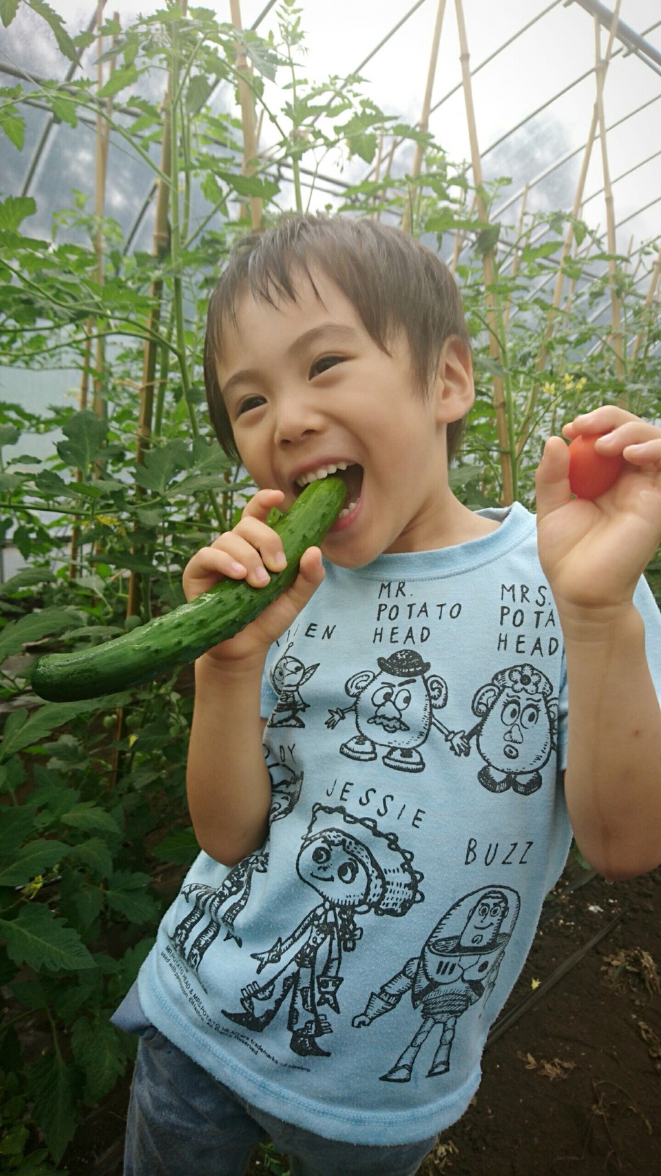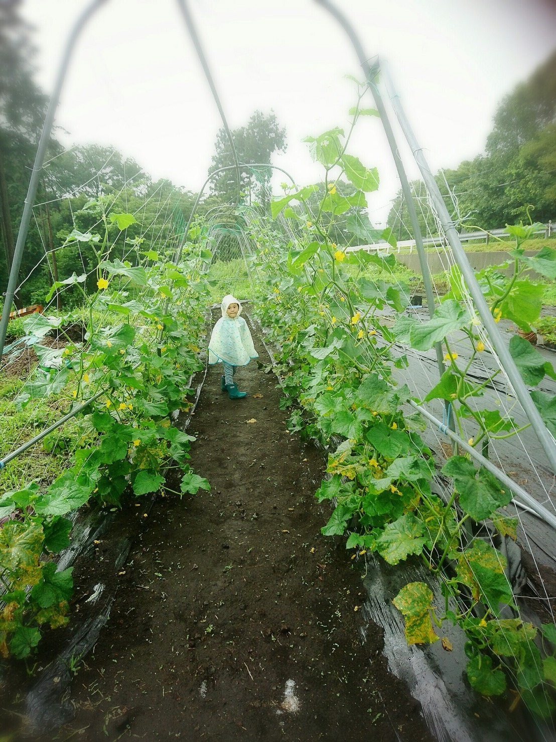 アメニモマケズ、キュウリもぎ食べ収穫。