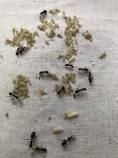 なぜかウール工房のテーブルの上のカゴの下に、幼虫を大量に運び込んでいた。