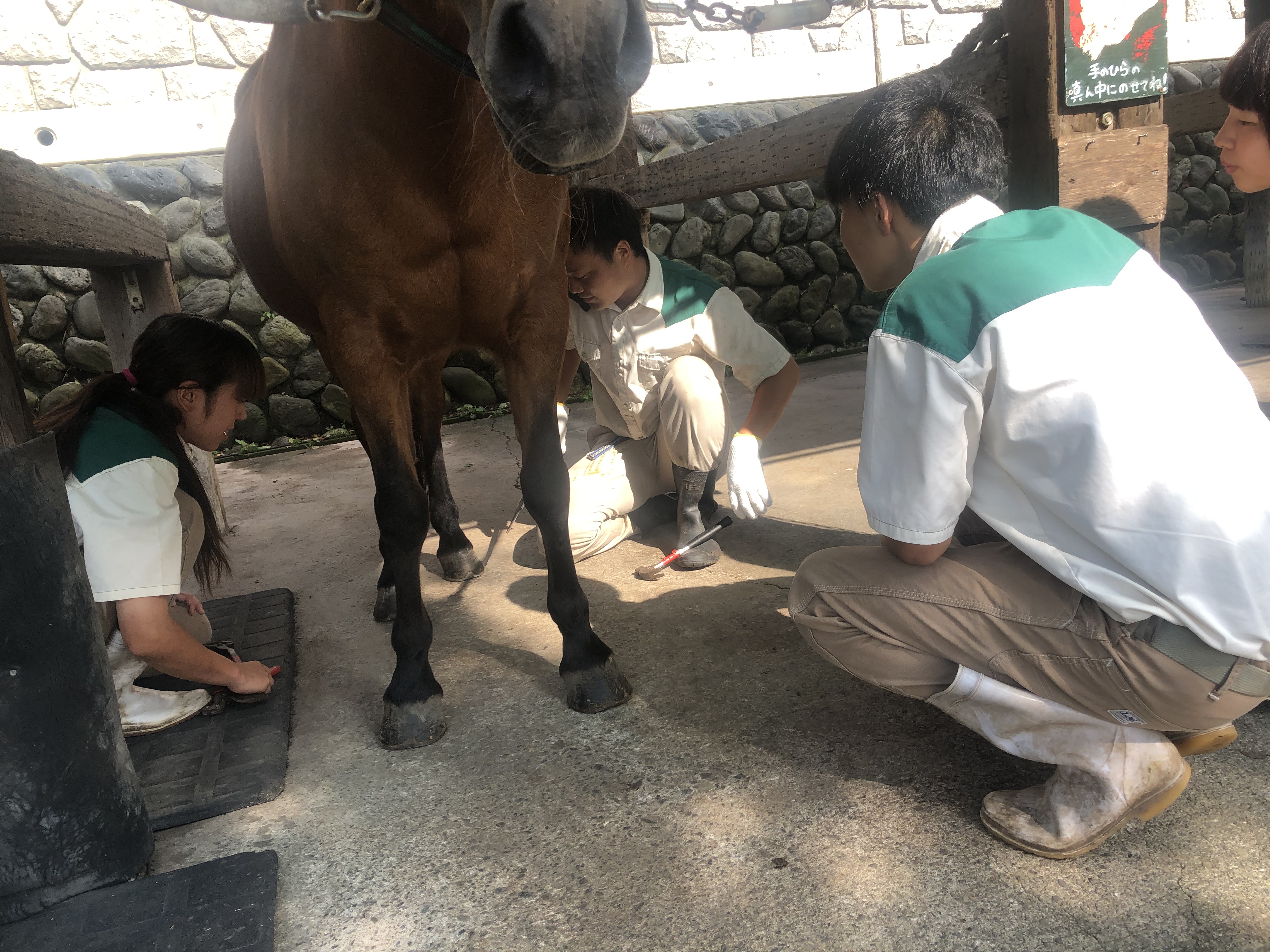 蹄鉄の打ち方について、後輩やサイトウお姉さんに指導。